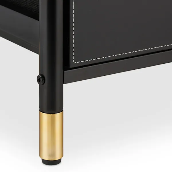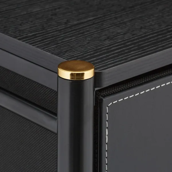 - Levererar en sofistikerad look med läderliknande lådfronter och gyllene accenter.