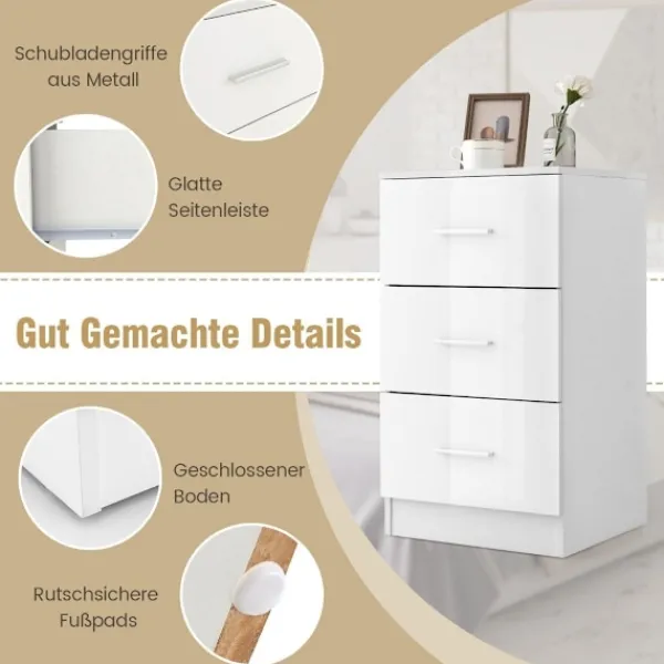Med en modern och glansig finish förhöjer detta arkivskåp atmosfären i alla kontorsutrymmen. De eleganta, enkla handtagen kompletterar dess moderna utseende och ger en ljus och fräsch touch till din miljö. Den stabila ovansidan är perfekt för att visa foton, konsttryck eller ytterligare kontorsmaterial.
