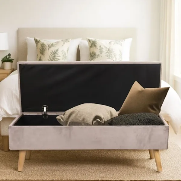 Den moderna förvaringsbänken erbjuder mångsidiga sittplatser och gott om förvaring, vilket gör den idealisk för alla rum. Dess mjuka sammetsklädsel och nedfällbara sits ger komfort och funktionalitet.