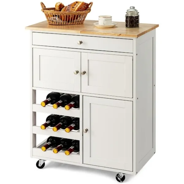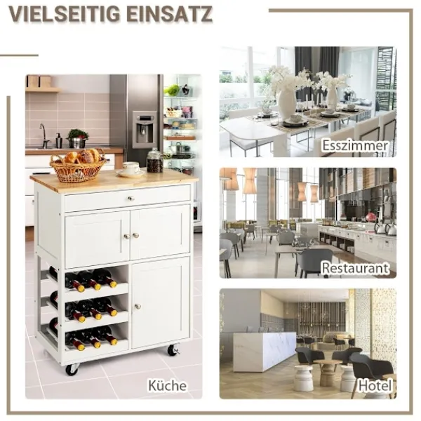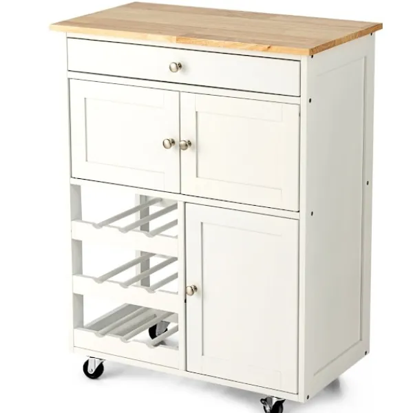 Den här köksvagnens smarta förvaringsdesign innehåller tre skåpsfack, tre vinställ och en låda, vilket ger gott om utrymme för att möta dina olika förvaringsbehov. Oavsett om det är rätter, vinflaskor eller andra nödvändigheter i köket, erbjuder denna vagn en plats för allt. Den enkla strukturen säkerställer att monteringen är enkel, vilket gör att du enkelt kan ställa in den.