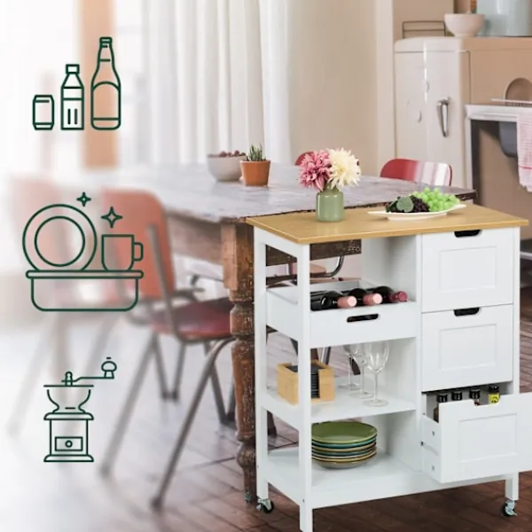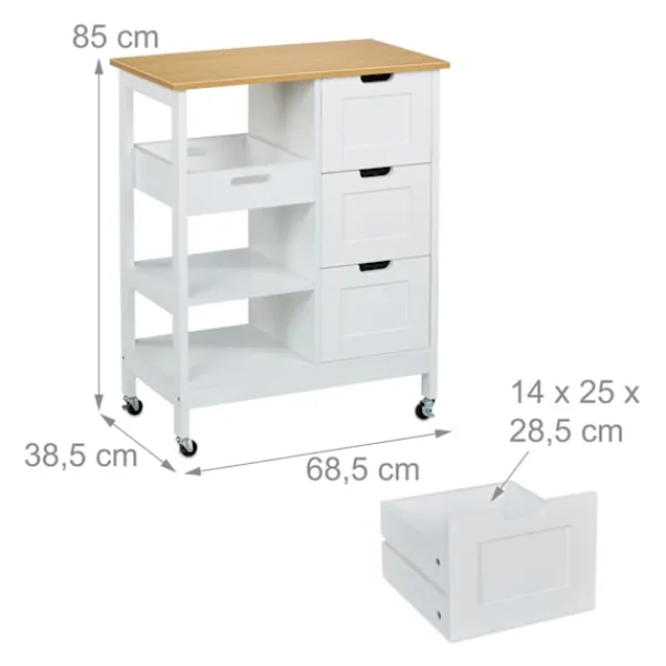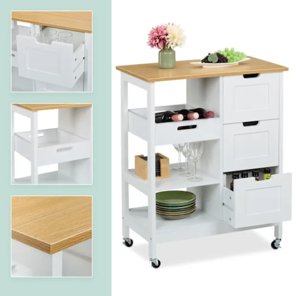 Den mobila köksvagnen förbättrar köksorganisationen med en rymlig arbetsyta för matlagning. Förvara och få tillgång till väsentliga saker utan ansträngning med dess mångsidiga design.