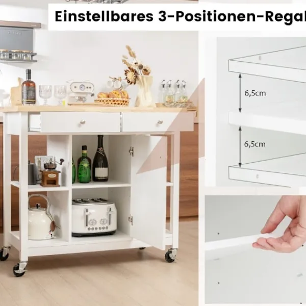 Rörlighet är en bris med köksvagnens 4 svängbara hjul, som möjliggör smidig förflyttning från köket till matsalen. Två av hjulen är låsbara, vilket ger stabilitet vid behov. Dessutom kan hjulen tas bort, vilket förvandlar vagnen till ett stationärt köksskåp. Vagnens användarvänliga design inkluderar greppvänliga handtag, släta metallskenor och förbättrade mjukstängande gångjärn för säker och bekväm användning.