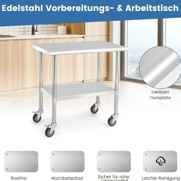 Tillverkad av förstklassigt rostfritt stål, vår arbetsbänk har utmärkt vattenbeständighet och är motståndskraftig mot korrosion, vilket säkerställer en lång livslängd. Den polerade ytan är lätt att rengöra, vilket gör den idealisk för mathantering. Det här rymliga bordet mäter 91,5 x 61 x 89,5 cm (L x B x H), och erbjuder gott om förvaringsutrymme med en lastkapacitet på 150 kg på bordsskivan och 100 kg på den nedre hyllan. Den justerbara nedre hyllan rymmer föremål i olika storlekar, vilket förbättrar dess användbarhet. Arbetsbänkens fyra universalhjul ger maximal rörlighet, medan de två låsbara hjulen säkerställer stabilitet vid behov, vilket gör den perfekt för att lasta eller hantera mat.