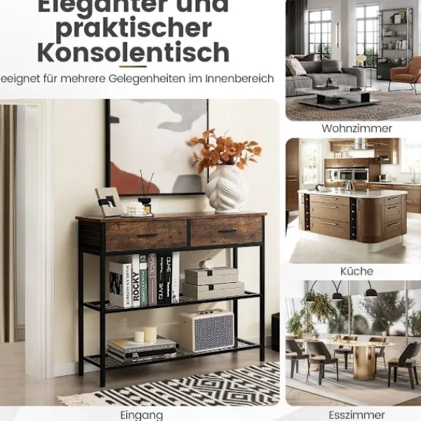 Den industriella looken med en träliknande struktur gör detta konsolbord till ett perfekt komplement till ditt vardagsrum. Oavsett om det placeras i entrén, vardagsrummet, köket eller matsalen kommer detta eleganta bord alltid att vara funktionellt och dekorativt. Med alla nödvändiga tillbehör och en tydlig bruksanvisning är entrébordet lätt att montera, vilket sparar tid och ansträngning. Dagligt underhåll kräver endast en mjuk trasa.