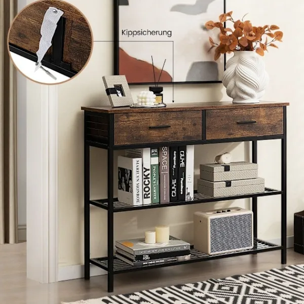 Konsolbordet har en förstärkt metallram gjord av högkvalitativa material, resistent mot böjning och deformation. För att förhindra rost är ramen belagd med en plastspray, vilket säkerställer både stabilitet och livslängd. Genomtänkta detaljer inkluderar en slät, reptålig yta på bordsskivan och lådorna, och varje låda är utrustad med ett bekvämt handtag för enkel åtkomst. Tippskyddet på baksidan förhindrar effektivt konsolbordet från att välta, vilket garanterar säkerheten.