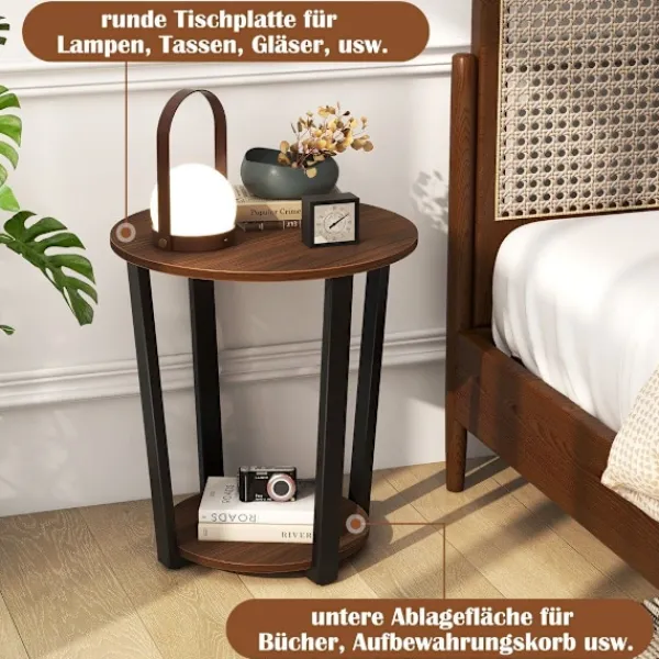 Vårt runda sidobord introducerar en perfekt blandning av stil och funktionalitet och ger en touch av industriell charm till ditt vardagsrum. Designat med en öppen hylla i två våningar, erbjuder detta accentbord gott om förvarings- och utställningsutrymme, vilket gör det till ett idealiskt komplement till alla rum. De pulverlackerade metallrören säkerställer hållbarhet, medan de justerbara fotkuddarna på metallbenen ger ökad stabilitet. De rustika träfibrerna kompletterar den mattsvarta metallramen och integreras sömlöst med dina befintliga möbler. Oavsett om det placeras bredvid din soffa eller används som ett elegant nattduksbord, är detta mångsidiga sidobord ett måste i alla hem.