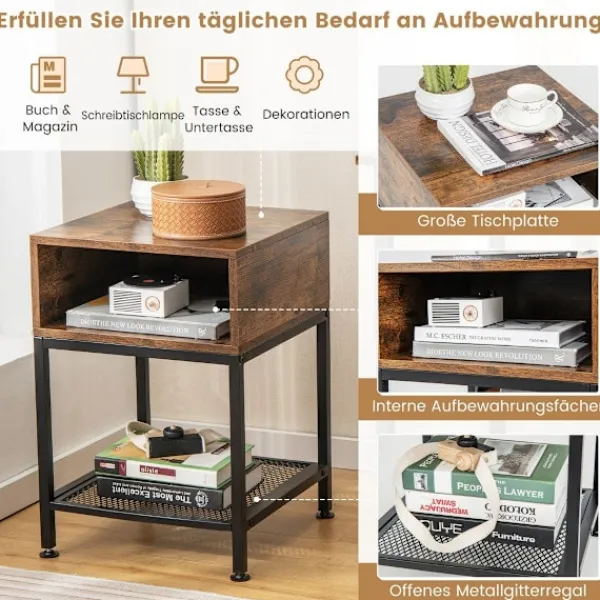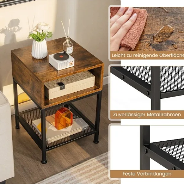 Den klassiska stilen på detta fyrkantiga sidobord har en vintagelook som kompletterar de flesta inredningsdesigner. Bordsskivan av trä passar vackert ihop med den eleganta svarta metallramen, vilket ger charm och stil till alla rum. Oavsett om det placeras i vardagsrummet eller används som nattduksbord, förstärker det ditt utrymmes estetiska tilltalande. Designen i tre nivåer möter dina dagliga förvaringsbehov, med en rymlig bordsskiva för en skrivbordslampa, kopp och fat. Det inre förvaringsfacket är perfekt för böcker och tidningar, medan den öppna metallgallerhyllan nedanför kan användas för krukväxter eller dekorationer.