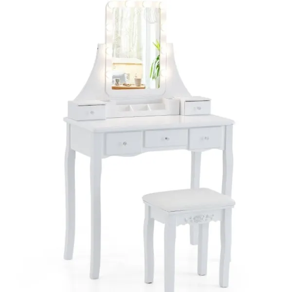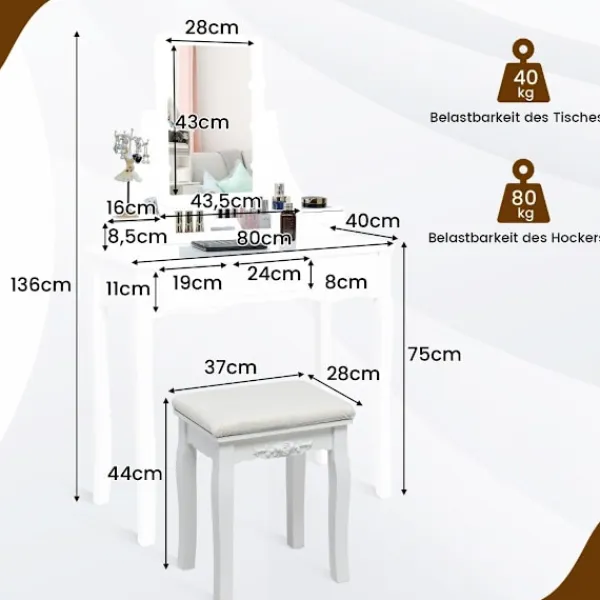 – Användarvänliga funktioner: Spegeln ger högupplösta bilder för sminkapplicering och roterar 360° för att möta olika sminkbehov. Den vadderade pallen är mjuk och bekväm. Den avtagbara bordsskivan gör att underdelen kan användas som skrivbord vid behov.