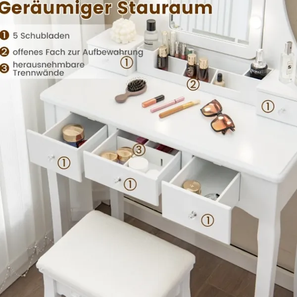 – Rymlig förvaring: Bordsskivan mäter 80 x 40 cm, vilket ger gott om plats för dina kosmetika och sminkverktyg. Dessutom erbjuder fem lådor med löstagbara avdelare och ett öppet förvaringsutrymme generöst utrymme för att organisera alla dina kosmetika, hudvårdsprodukter, smycken och mer.