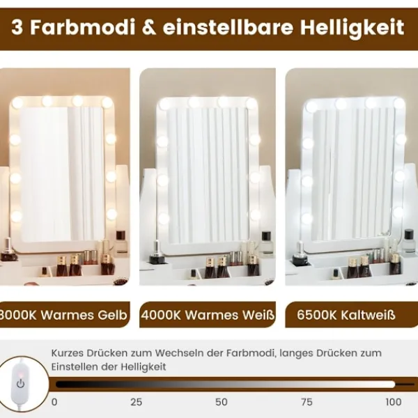 – Olika belysningsalternativ: Den rektangulära spegeln är prydd med 10 glödlampor som erbjuder tre färglägen (3000K varmgul, 4000K varmvit, 6500K kallvit) och justerbar ljusstyrka. Användare kan anpassa belysningen för att passa deras sminkbehov.