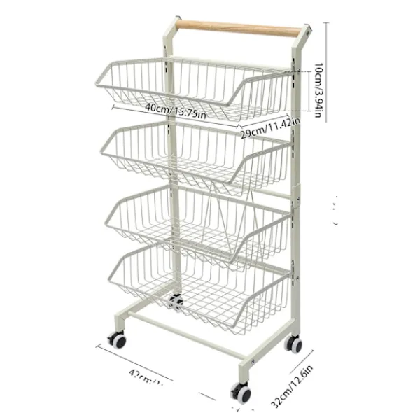 - effektiv förvaringslösning: med fyra rymliga hyllor erbjuder denna vagn gott om utrymme för att organisera köksutrustning, från kokkärl till frukter och grönsaker, vilket förbättrar din köks renlighet och funktionalitet.