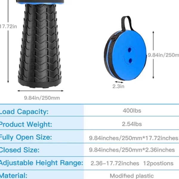【Säker och stabil】 Den andra generationens uppgradering gjord av högkvalitativ PA+ABS-plaststyrka, hållbar och miljövänlig, cylindrisk konstruktion, fasta stängningar och en halkfri botten säkerställer att denna fällbara pall ger en säker och bekväm sittkomfort. Maximal belastning: upp till 180 kg
