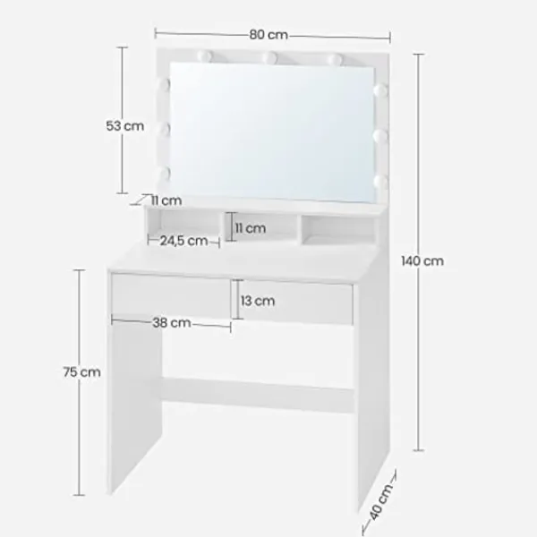 Specifikationer:- Färg: Vitmaterial: Partikelbord- Produktstorlek: 80 x 40 x 140 cm (l x w x h)- Produktvikt: 26,5 kg-max. Statisk lastkapacitet för bordets topp: 27 kgPackage Innehåll:- 1 x toalettbord- 9 x LED-glödlampa- 1 x Monteringskit- 1 x Anti-Tip Kit- 1 x Instruktioner