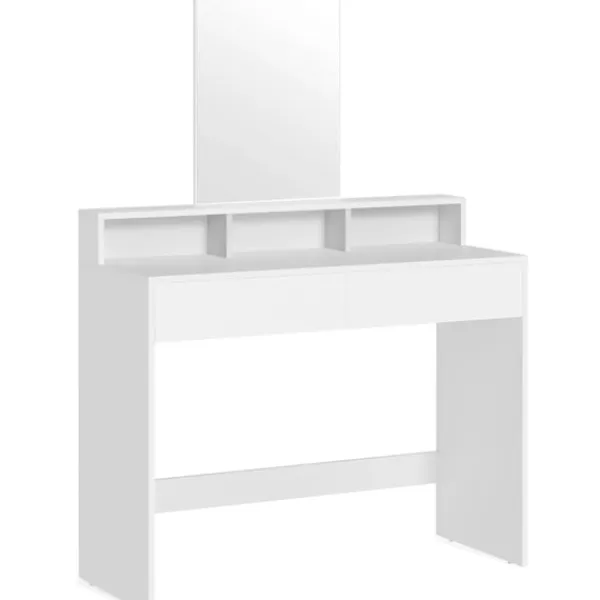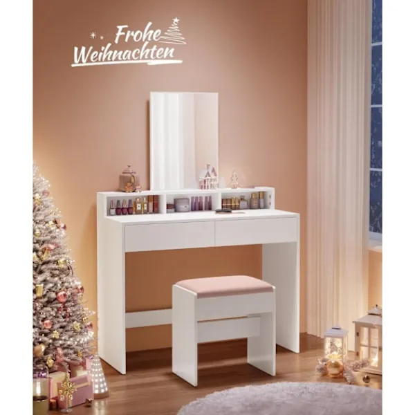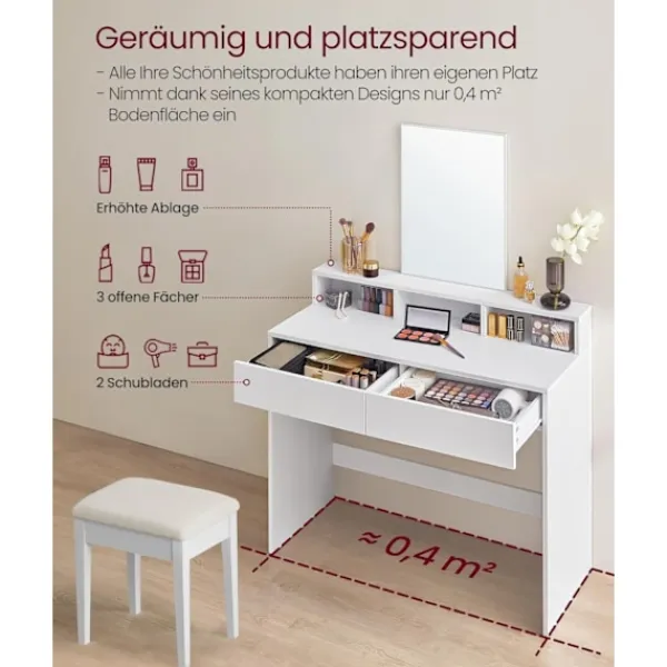 Rymligt och utrymmesbesparande: Med 2 lådor, en stor bordsskiva och 3 öppna fack erbjuder detta sminkbord gott om plats att förvara ditt smink prydligt och till hands; med en basyta (40 x 100 cm) är den perfekt för små utrymmen[Stor, genomskinlig spegel] Sminkbordets stora spegel på 40 x 53 cm (B x H) gör att du kan spegla tydligt och sminka dig perfekt[Lutskydd för mer säkerhet] Fäst kosmetikabordet på väggen med det medföljande lutningsskyddet för att skapa en säkrare miljö[Enkelt och modernt] Enkel design, rena linjer och elegant vit gör detta moderna toalettbord till ett elegant tillskott till ditt sovrum eller omklädningsrum[Robust och lätt att rengöra] Detta toalettbord tillverkat av kvalitetsspånskiva är robust och hållbart; dess beläggning är slitstark och lätt att rengöra, vilket möjliggör lång användning