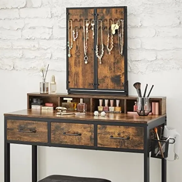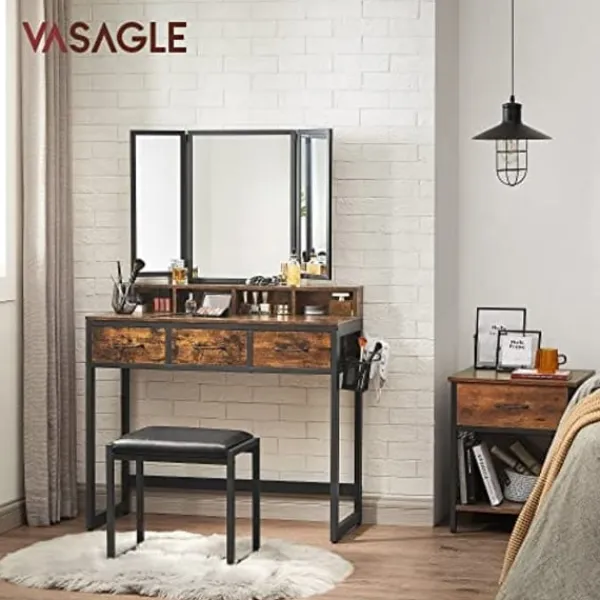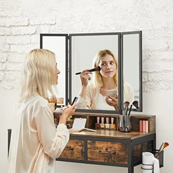 Vad du får: Ett imponerande toalettbord med en 3-delad fällbar spegel, en vadderad pall för extra komfort, en tydlig instruktioner för enkel montering och möjligheten att göra ditt skönhetsområde effektivt