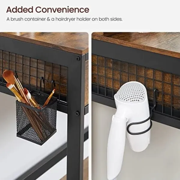 Ännu mer? Självklart! Hur kan en charmig tjej leva utan skötselprodukter och hårstylingverktyg? Det är därför detta toalettbord är utrustat med 4 hyllor under spegeln, samt en förvaringslåda (8 x 8 x 10 cm) och en hårtorkhållare på sidan