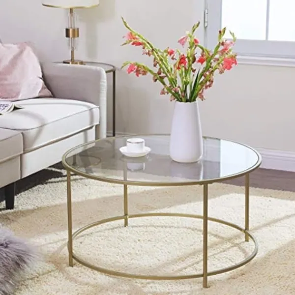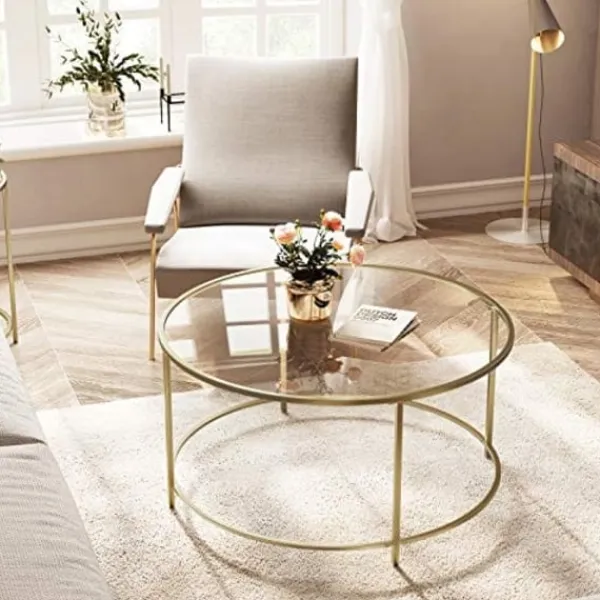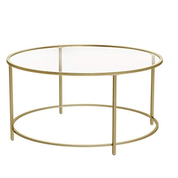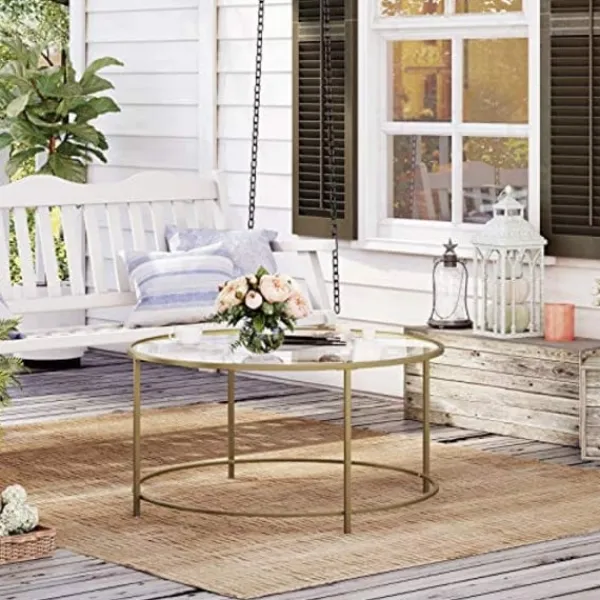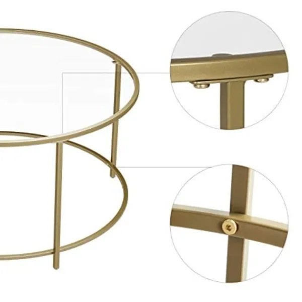 Stylish Appeal: En rundad, guldfärgad stålram och en härdad glasstopp-dessa två lockande element smälter samman i detta charmiga soffbord, vilket skapar en toppmodern look i ditt utrymme