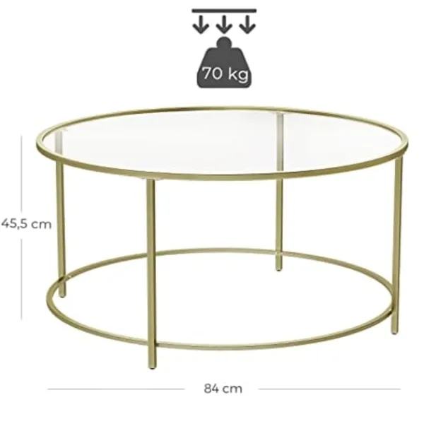 Specifikationer:- Färg: guldmaterial: stål, härdat glasproduktstorlek: 84 x 45,5 cm (dia. X h)- Produktvikt: 11,5 kg-max. Statisk lastkapacitet: 70 kg paketinnehåll:- 1 x glas soffbord- 1 x Tillbehörspåse- 1 x instruktioner