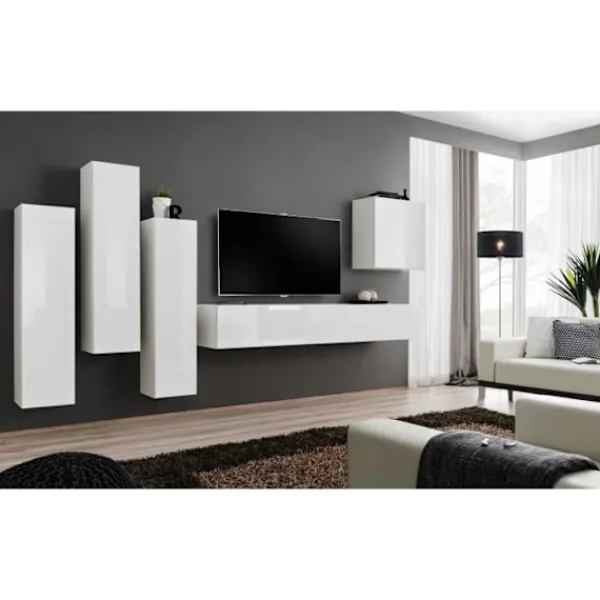 Vit SWITCH III TV-enhet. Denna uppsättning består av två tv-bänkar: 120x37x45 cm med 1 nedfällbar dörr och 3 fack, tre vägghyllor: 100-120x20x20 cm, tre hängande pelare: 40x126x29 cm med en solid dörr och 2 hyllor, en