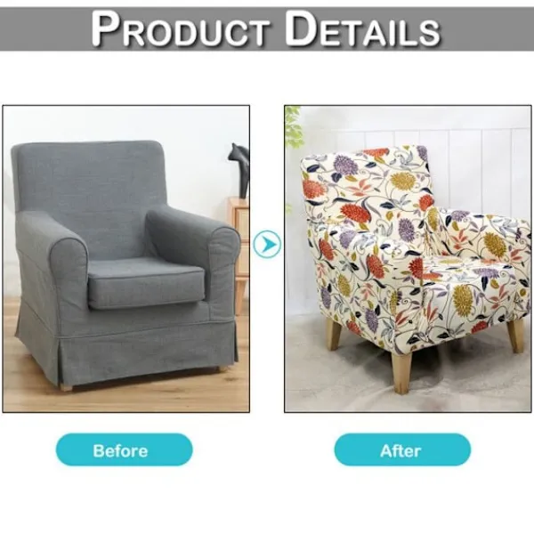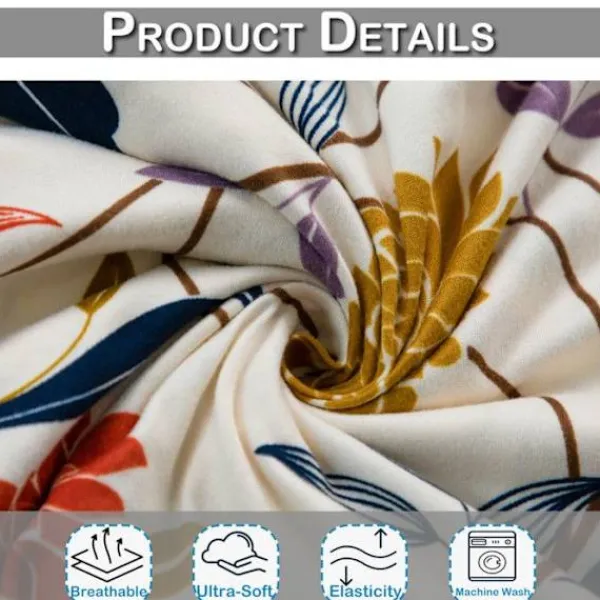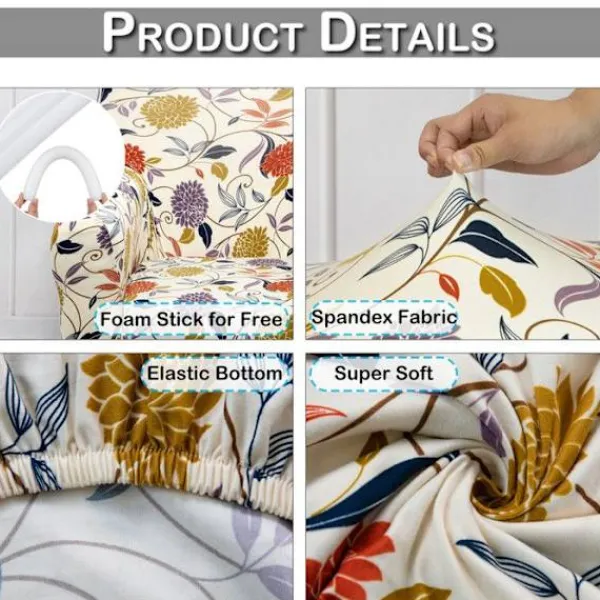 Utsträckbar fåtöljöverdrag – 92% polyester + 8% elastan. Blommönster (Crème). Anpassningsbara dimensioner: passar för stolar med måtten 51-79cm (B) x 61-79cm (D) x 71-89cm (H). Lätt att installera utan fästen. Maskintvättbar (kallt vatten, inget blekmedel, torktumling låg temperatur). Fläcksäkert och slitstarkt. Perfekt för att förnya eller skydda en fåtölj. Obs: mönstren kan variera något.