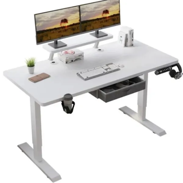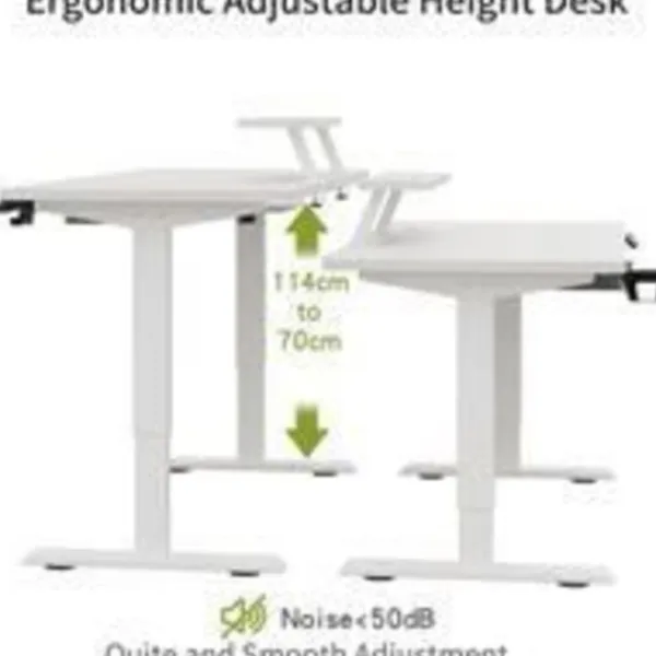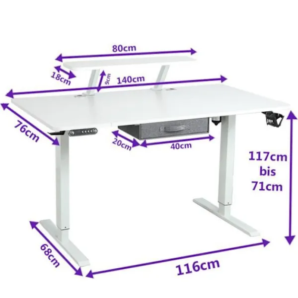 Detta smarta, höj- och sänkbara stående skrivbord främjar komfort och produktivitet. Den är designad för att arbeta hemma och ger en pålitlig arbetsyta. Levereras med en extra krok och en trådkorg för upphängning. Solid konstruktion med robust stålram. Enkel montering. Mått: L 140 x D 76 x H 114 cm.