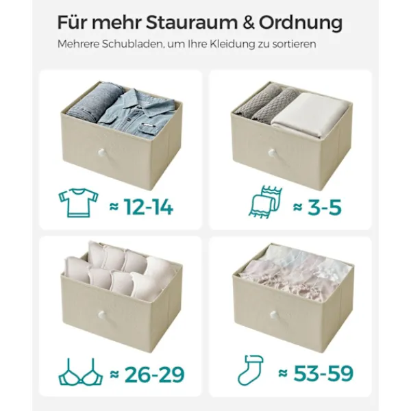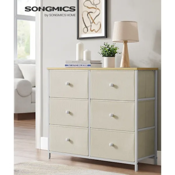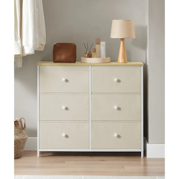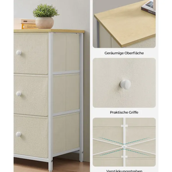 Med sin kamelgul-krämvita färg och lådfronter i tyg ger detta skåp en touch av elegans till alla rum och smälter sömlöst med vilken inredning som helst.