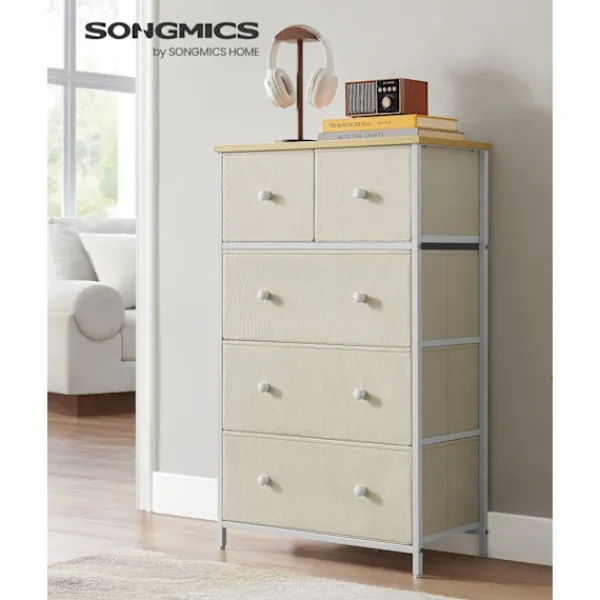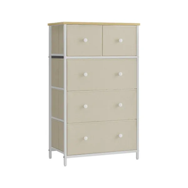 Den kamelgul-krämvita färgpaletten och lådfronterna i tyg ger en touch av sofistikering till alla inredningar. Dess mångsidiga design gör den lämplig för olika rum, inklusive sovrum, vardagsrum eller kontor.