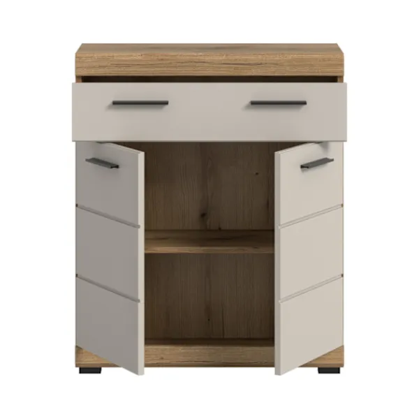 Rootz freestanding skåp erbjuder eleganta och mångsidiga lagringslösningar. Med sin rymliga design, med två dörrar, en låda och justerbara hyllor, ger det gott om utrymme för organisation. Den högkvalitativa MDF-fronten med malade spår ger en touch av sofistikering, medan den reversibla dörrledningen förbättrar flexibiliteten i någon rumslayout. Idealiskt för moderna vardagsrum kompletterar detta skåp dagens snygga heminredning.