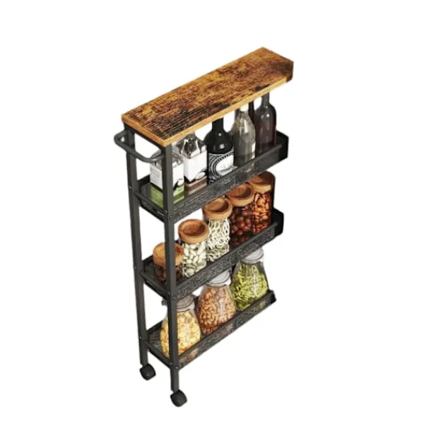 Rootz -rullande bilen är en elegant och praktisk kökslösning perfekt för alla hem. Med sin snygga vintage bruna svarta finish kombinerar den funktionalitet och estetik för att tillgodose dina lagringsbehov. Tillverkad av robust träflisbräda och stål har denna smala vagn fyra nivåer för mångsidiga lagringsalternativ samtidigt som en total statisk belastningskapacitet på 20 kg.