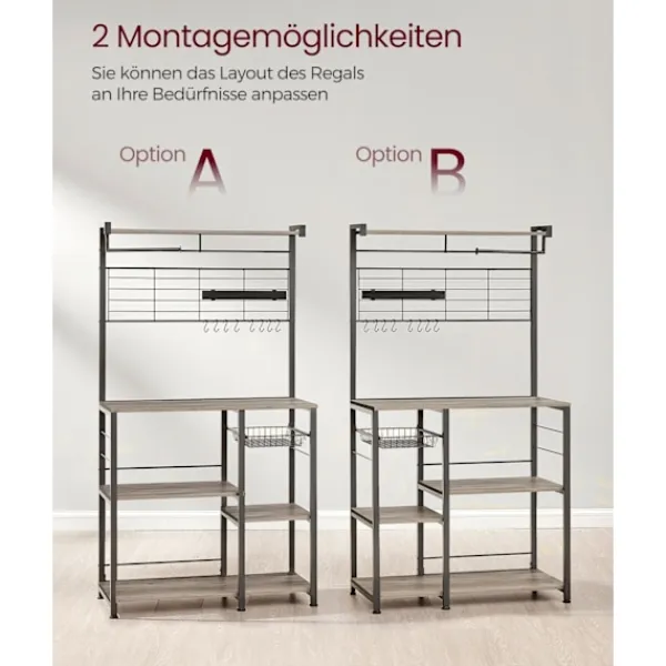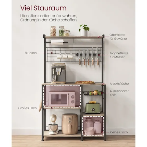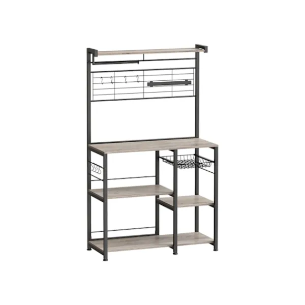Med flera hyllor och en trådkorg erbjuder det här köksstället omfattande förvaringsmöjligheter för dina redskap, köksredskap och andra nödvändigheter, vilket håller ditt utrymme snyggt och välorganiserat.