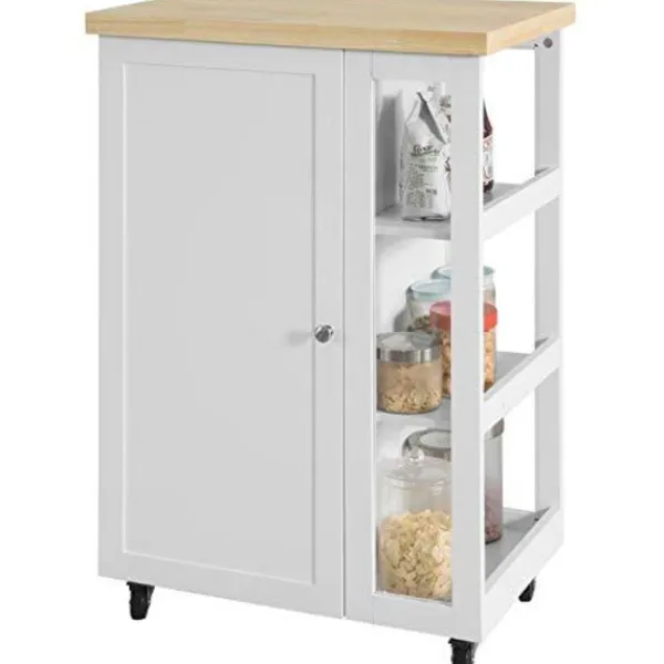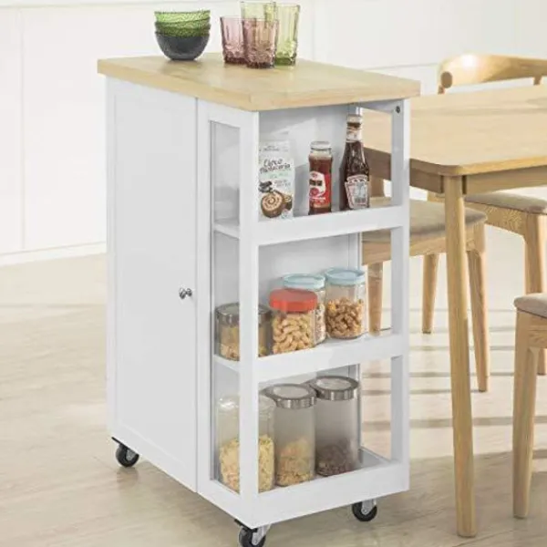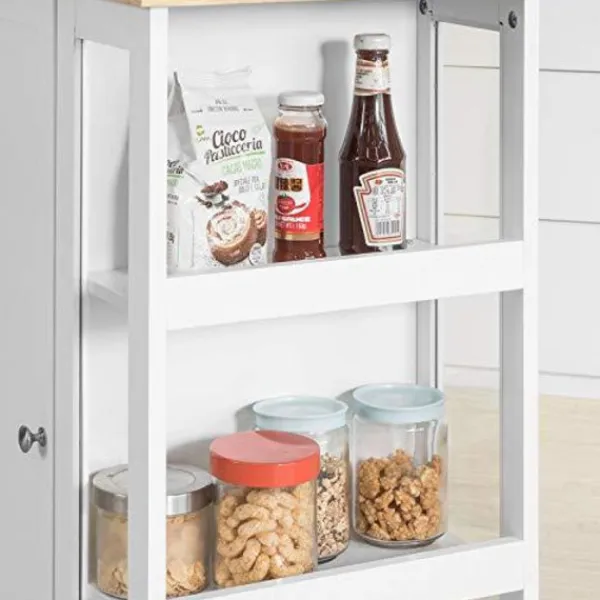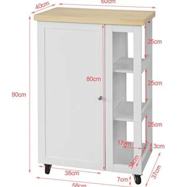 Detaljer: Gedigen och snygg köksvagn är idealisk för ditt kök eller någonstans där du behöver extra förvaringsutrymme för redskap. Den har ett skåp med 2 invändiga justerbara hyllor. Sidostället med 3-vånings hyllor ger extra förvaringsutrymme för dig. Med 4 hjul (2 hjul med bromsfunktion) kan du enkelt flytta runt vagnen i ditt kök. Tillverkad av högkvalitativ MDF i vit lack. Toppen är gjord av MDF med träfanér av gummi. Med denna köksvagn skulle ditt kök bli stiligare och rymligare. Produktinformation Material: MDF. Färg: Vit + natur. Mått: B60 x D40 x H90cm. Vikt: 26kg. Lastkapacitet: 50 kg. Varan kommer i en platt förpackning och kräver självmontering. Detaljerade instruktioner medföljer. De dekorativa elementen ingår inte i leveransen. Vänligen kontakta oss via e-post när du har några frågor, vi svarar så snart som möjligt!