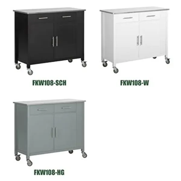 - Den har en bänkskiva i rostfritt stål, 2 lådor, 1 skåp med 2 invändiga justerbara hyllor, 3 sidohyllor, 1 hushållsrullehållare och 4 hjul.
