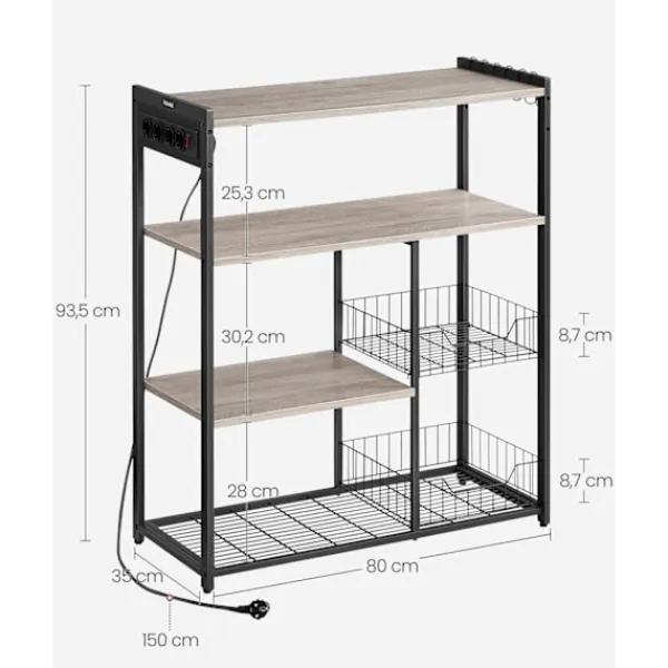 Uppgradera ditt kök med The Rootz Kitchen Shelf med uttag i en stilig greige melerad svart yta. Perfekt för att organisera dina matlagningssaker och samtidigt ge bekväm åtkomst till eluttag.
