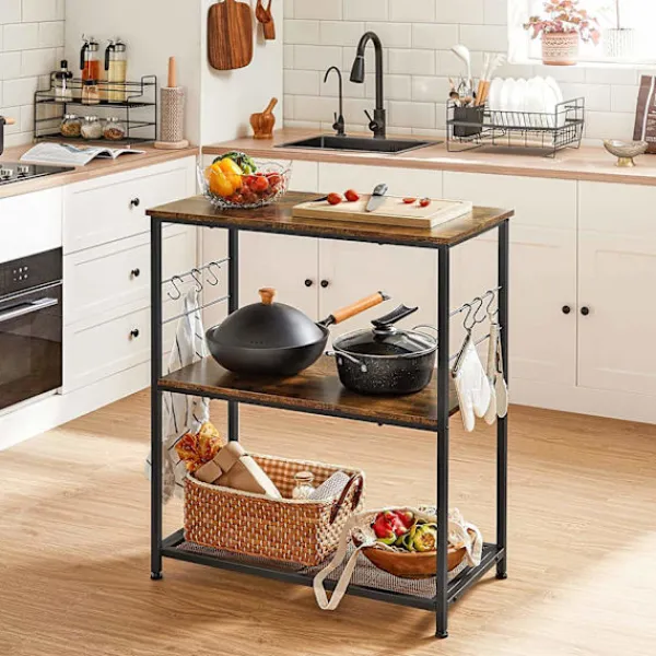 Ge ditt kök en touch av industriell charm med denna mångsidiga hylla med krokar för extra funktionalitet.