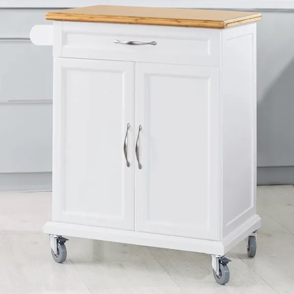 Detaljer: Superbekvämt köksskåp är perfekt för ditt kök, pentry eller var du än behöver extra förvaringsutrymme för redskap. Produktegenskaper Modern design Stabil och hållbar Olika förvaringsmöjligheter Bänkskiva i bambu 1 låda 1 skåp 1 handdukstork 4 gummihjul, 2 med bromsar Produktinformation Material: Massivt trä, MDF, bambu. Färg: Vit + Natur. Mått: B66 x D46 x H91cm. Bänkskiva Storlek: B66 x D46cm. Vikt: 23,5 kg. Lastkapacitet: 80 kg. Varan levereras platt packad och kräver enkel montering. Detaljerade instruktioner medföljer. De dekorativa elementen ingår inte i leveransen. Vänligen kontakta oss via e-post när du har några frågor, vi svarar så snart som möjligt!