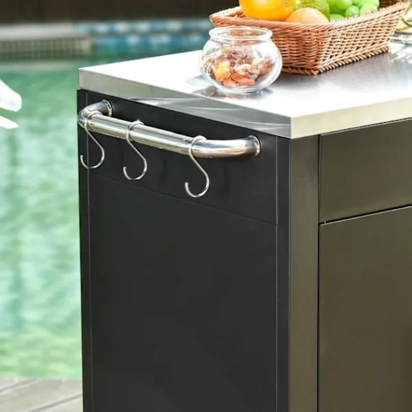 Jämfört med en vanlig bänkskiva i trä är Rootz Kitchen Trolley lättare att rengöra och förvara. Tack vare sin genomtänkta design har ingen sidovägg lämnats kvar, så du kan enkelt komma åt dina tillbehör när du lagar mat. Sex förkromade krokar ger förvaringsutrymme för kökstillbehör. En kompakt och fullt fungerande köksvagn väntar på dig!