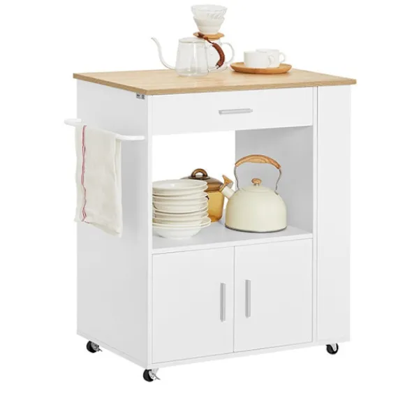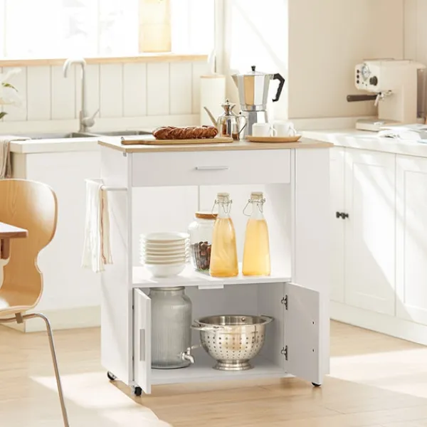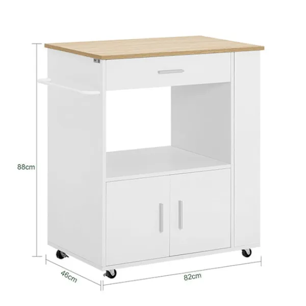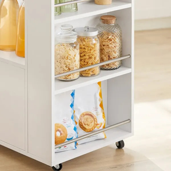 Utrustad med fyra robusta hjul, varav två har stopp, kan denna köksvagn enkelt flyttas runt ditt kök eller matplats, vilket säkerställer att allt du behöver alltid finns inom räckhåll.