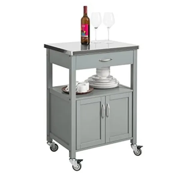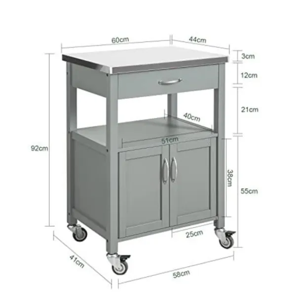 Detaljer: Den här moderna köksvagnen är ett bra komplement till ditt kök. Den har en låda, en öppen hylla och ett skåp, vilket ger dig gott om förvaringsutrymme. Bänkskivan erbjuder tillräckligt med utrymme för att lagra och förbereda mat. Med 4 hjul (2 med broms) kan du enkelt flytta vagnen runt ditt hem. Tillverkad av högkvalitativ MDF och furu i grå lack. Toppen är gjord av MDF och rostfritt stål. Stabil och hållbar. Snygg och funktionell, den här vagnen är perfekt för ditt kök, matsal och andra platser som behöver extra organisation. Produktdetaljer Material: MDF, furu, rostfritt stål. Mått: B60 x D44 x H92cm. Vikt: 18,5 kg. Lastkapacitet: 45 kg. De dekorativa elementen ingår inte i leveransen. Varan kommer i en platt förpackning och kräver självmontering. Detaljerade instruktioner medföljer. Vänligen kontakta oss via e-post när du har några frågor, vi svarar så snart som möjligt!