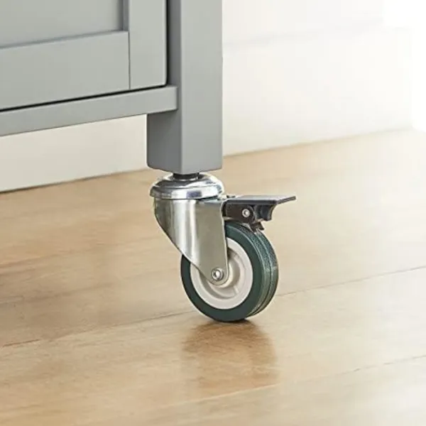 - Den har en låda, en öppen hylla, ett skåp och 4 hjul (2 med broms).