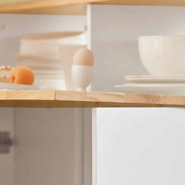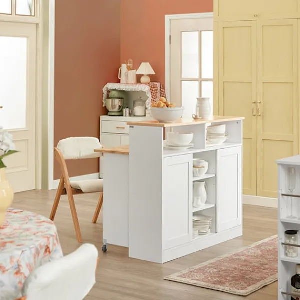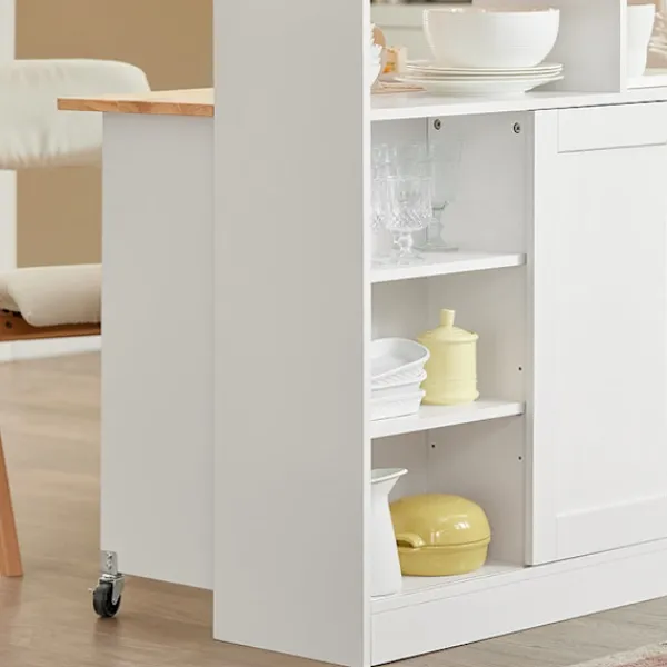 Skänken har en vikbar arbetsyta med två robusta gummiträskivor. Denna utrymmesbesparande design ger extra utrymme när du behöver det, vilket gör den perfekt för kompakta utrymmen.