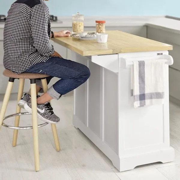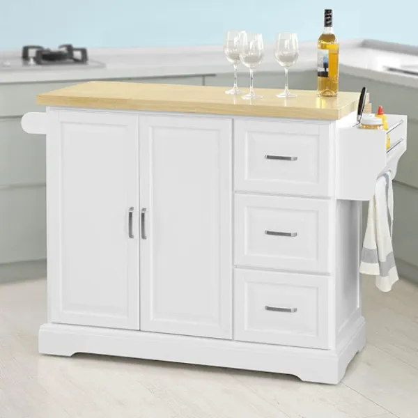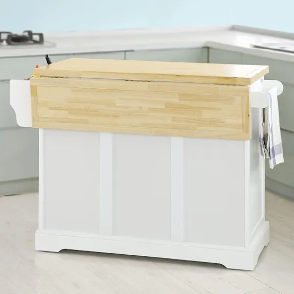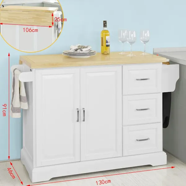 - Modern design köksö har utdragbar gummiträ bänkskiva, 3 lådor, 1 skåp med invändig justerbar hylla, 1 handduksställ och 1 sidoförvaringsställ.