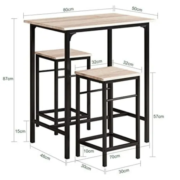 Detaljer: 3 stycken Bar Set – ett barbord och två pallar – är det perfekta tillskottet till alla familjehem. Modern design, stark metallram, stabil struktur. Tillverkad av högkvalitativ MDF belagd med PVC och svart pulverlackerad stålram. En utmärkt lösning för köket, vardagsrummet och baren etc. Detta utrymmesbesparande matset är praktiskt och modernt och ger en funktionell och avkopplande plats att äta och dricka med vänner och familj. Produktinformation Material: MDF, metall. Bordsmått: L80 x B50 x H87cm. Pall Mått: L32 x B32 x H57cm. Setets vikt: 16,6 kg. Lastkapacitet: Bord: 60kg. Pall: 120 kg. Varan kommer i en platt förpackning och kräver självmontering. Detaljerade instruktioner medföljer. De dekorativa elementen ingår inte i leveransen. Vänligen kontakta oss via e-post när du har några frågor, vi svarar så snart som möjligt!
