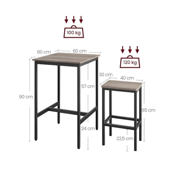 - Mått: Bord: 60 x 60 x 90 cm (D x B x H); Pall: 30 x 40 x 65 cm (D x B x H)