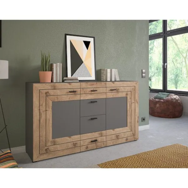 Uppgradera ditt bostadsutrymme med den mångsidiga rootz freno -skänket med en modern grå replikfront och kropp med en Nox Oak Replica -finish. Denna 160x90x40 cm skänk erbjuder 2 dörrar, 4 lådor och 4 hyllor för gott om lagringsutrymme. De fullständiga förlängningslådorna tillåter enkel åtkomst.