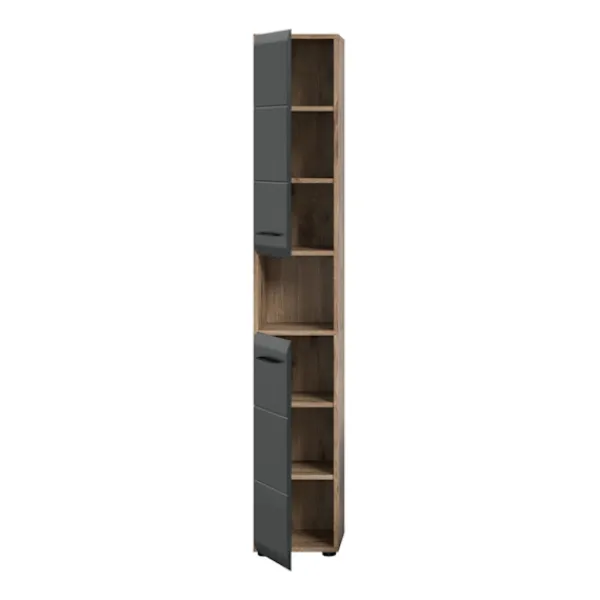 Förbättra ditt utrymme med det höga skåpet i svart och brunt. Detta eleganta skåp, med sin sofistikerade högkvalitativa MDF-front och spårfräsning, ger mångsidiga lagringslösningar. Den har två dörrar, fyra höjdjusterbara hyllor och rymliga fack, som kompletterar skandinavisk elegans med enkla vårdytor och enkel montering. Perfekt för samtida och elegant organisation.