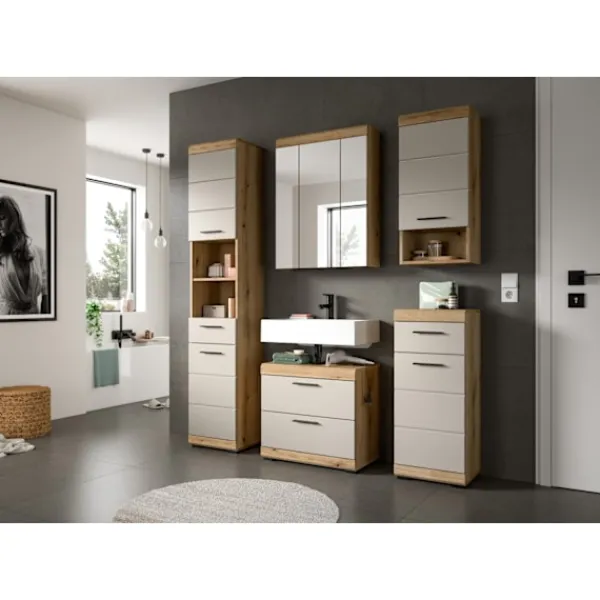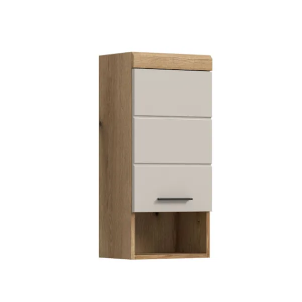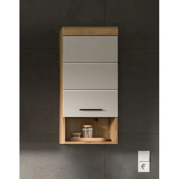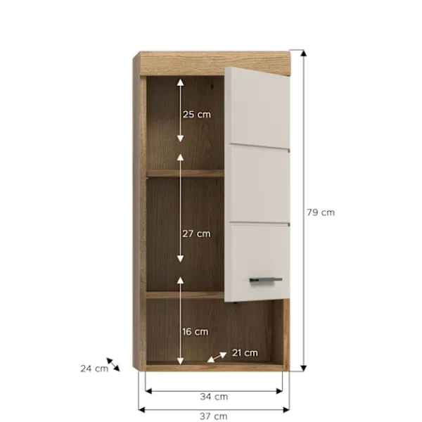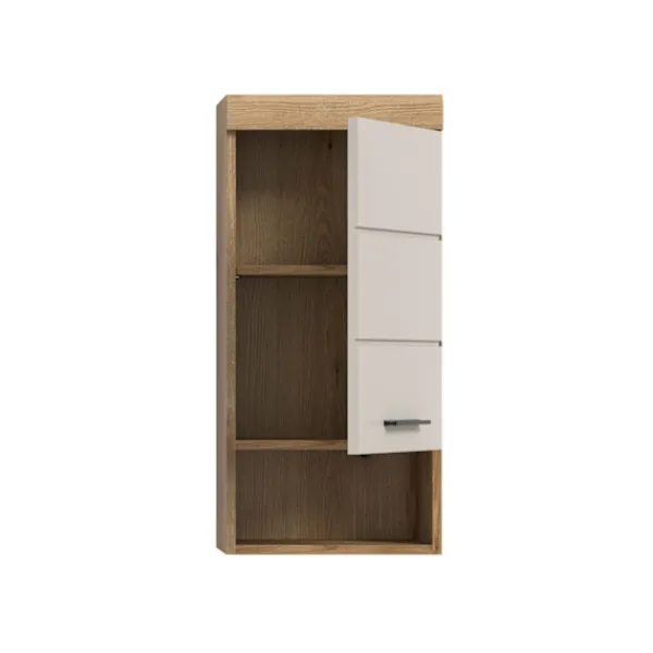 Det väggmonterade basskåpet i matt brun och vit imitation (37 x 79 x 24 cm) erbjuder gott om lagringsutrymme i en kompakt design med en dörr, en höjdjusterbar hylla, två stängda fack och ett öppet fack. Det reversibla dörrledet gör att du kan anpassa skåpet efter behov, vilket gör det perfekt för badrum eller vardagsrum med begränsat utrymme. Den högkvalitativa MDF-fronten säkerställer hållbarhet.