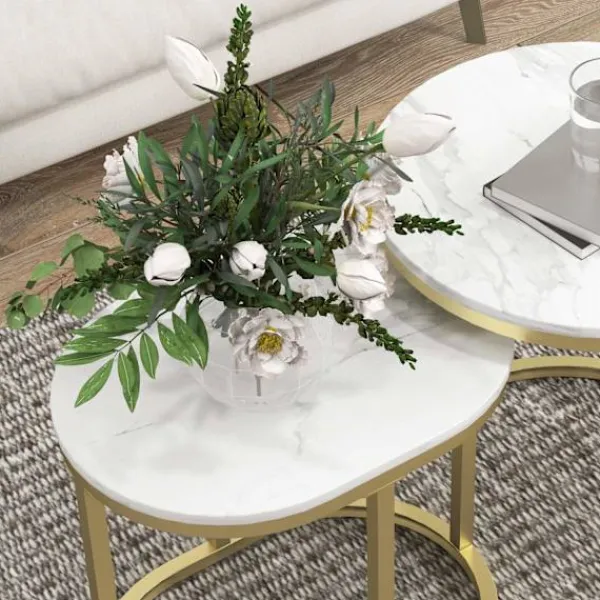 ROOTZ 2 -set soffbord har en elegant marmorutseende med en hållbar stålram. Perfekt för alla bostadsområden, dessa bord kan användas separat eller staplas ihop för att spara utrymme. Med höjdjusterbara fötter för att skydda dina golv är de både praktiska och mångsidiga, idealiska för att visa upp växter, böcker och dekor.