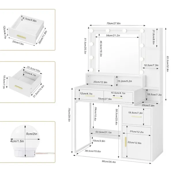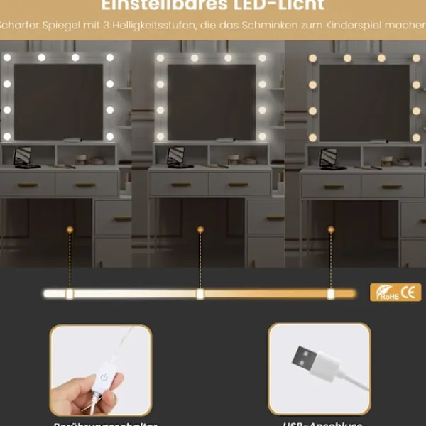 Med detta sminkbord med 10 LED-lampor kan du anpassa belysningen med tre ljusstyrkanivåer. Perfekt för att skapa den perfekta miljön för sminkapplicering eller hudvårdsrutiner.