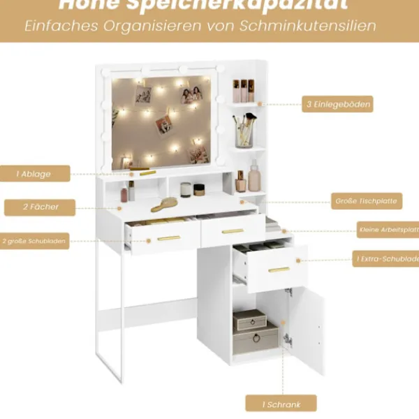 Ordna alla dina skönhetssaker med lätthet. Det här bordet innehåller 2 lådor, 1 fack med dörr och 3 hyllor, vilket ger gott om plats att förvara och komma åt dina produkter bekvämt.