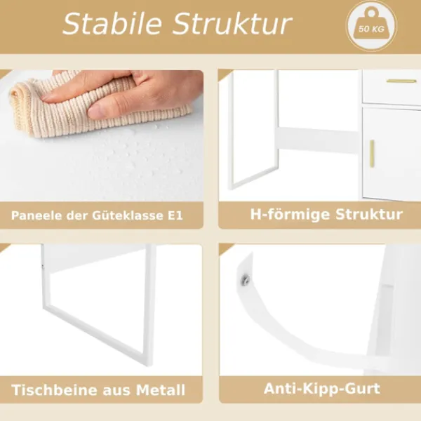 Det här toalettbordet är tillverkat av högkvalitativt trä med metallben och en förstärkt bottenbalk och erbjuder exceptionell stabilitet och hållbarhet, vilket säkerställer långvarig användning och enkelt underhåll.